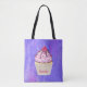 A tote bag with an illustration of a delicious looking cupcake. Pink frosting and chocolate drizzles. A yellow cupcake holder and a raspberry on top. Yummy! The background is a purple abstract texture with little hearts peppered throughout.