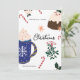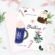 This pretty Christmas card features festive illustrations of beautiful holiday desserts and mistletoe on an elegant white background with a blush pink back of the card. Frosted cakes, whipped cocoa, and red and white candy canes make for a sweet holiday!