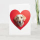 This card shows a light-colored dog’s face peeking out from the middle of a large red heart on a white background. The dog looks like a Labrador, with creamy fur, floppy ears, and a calm, curious expression. Its warm brown eyes look straight at you, with tiny light spots that make them feel bright and friendly. The nose is a soft pink, and you can see fine whiskers around the muzzle. The big heart behind the dog is a strong red that stands out clearly against the plain white space. There isn’t any text on the front, so the dog and heart are the main focus and the message stays open for your own words. It’s a sweet choice for someone who loves dogs and simple love notes 💘❤️.