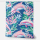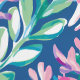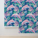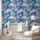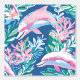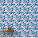 A seamless pattern featuring white and pink dolphins swimming in a blue sea filled with pink and blue marine plants. The design captures a whimsical and vibrant underwater scene with playful dolphins and colourful aquatic flora.