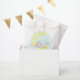 A charming watercolor illustration of a baby elephant peacefully sleeping on a crescent moon, surrounded by fluffy clouds and twinkling pastel stars. The soft colour palette of yellows, blues, and pinks creates a dreamy and whimsical atmosphere, perfect for a baby shower invitation. Ideal for a gender-neutral or baby girl celebration, this design evokes warmth, love, and the anticipation of welcoming a new little one.