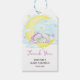 A charming watercolor illustration of a baby elephant peacefully sleeping on a crescent moon, surrounded by fluffy clouds and twinkling pastel stars. The soft colour palette of yellows, blues, and pinks creates a dreamy and whimsical atmosphere, perfect for a baby shower invitation. Ideal for a gender-neutral or baby girl celebration, this design evokes warmth, love, and the anticipation of welcoming a new little one.