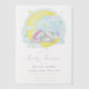 A charming watercolor illustration of a baby elephant peacefully sleeping on a crescent moon, surrounded by fluffy clouds and twinkling pastel stars. The soft colour palette of yellows, blues, and pinks creates a dreamy and whimsical atmosphere, perfect for a baby shower invitation. Ideal for a gender-neutral or baby girl celebration, this design evokes warmth, love, and the anticipation of welcoming a new little one.