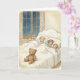 This greeting card shows a soft watercolor scene of two young kids asleep in a big bed, close together like they feel safe and cared for. The bedding is white, and the boy and girl have calm, relaxed faces with their eyes closed. On the left, a large window looks out to a dark blue night sky dotted with small golden stars. Light floral curtains frame the window, making the room feel warm and homey. A brown teddy bear with a little bow tie sits on the bed, and a rag doll rests beside the sleeping girl. On a nearby bedside table, there’s a small wooden duck on wheels, adding to the cozy bedtime setting. There isn’t any text shown on the front, so the artwork carries the message on its own—perfect for a gentle Valentine note ❤️💌🍫.