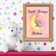 This is an adorable poster for the nursery of a baby girl or for a little girl's bedroom. The image is a baby girl elephant sleeping on a crescent moon surrounded by stars, with pink and peach as the main colours. This poster can be personalised by adding your own name and text to make it even more special.