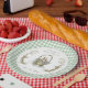 A charming and delicate baby shower paper plate featuring a soft pastel palette with a green gingham frame. The design incorporates sweet illustrations of fairytale accents in sweeping greens and vines. The design also has soft hues of blue blush pink, sage green. Whimsical flowers and greenery surrounds the sweet animal graphic giving it an elegant yet playful touch. Perfect for welcoming any gender baby. Personalise with Mum-to-Be name and date of event.