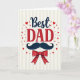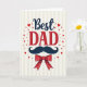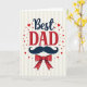 This card centres on a loving “Best DAD” message, with “Best” placed at the top in deep navy lettering and “DAD” set just below in strong red letters with small finishing strokes. The words feel like they lean towards each other, like a warm hug between parent and child 👨. Under the text sits a dark blue handlebar moustache with neat curled tips, giving the design a friendly, dressed-up look. Just beneath that, a bright red bow tie with small white dots adds a cheerful touch, like someone ready for a special day 👔. The background is filled with soft vertical stripes that alternate between pale cream and light beige, adding gentle texture without taking over. Small red hearts and tiny red dots are scattered around the centre, as if they’re floating upward in quiet affection. The main message stays in the middle of the card, with the hearts and dots surrounding it to guide your eyes back to the words. At the bottom area, the red bow tie sits neatly aligned under the moustache against the cream-and-beige striped backdrop.