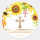 Elegant sunflower and gold cross baby baptism favour stickers or envelope seals- Displays lovely watercolor sunflower wreath in earthy colours of yellow, orange, brown, green, and a touch of light red above faux metallic gold cross. Metallic gold strip separates baby's name and baptism date underneath. Note: All images are printed. Not actual foil or metal. Beautiful summer or fall baby baptism favour stickers for proud parents to give to guests. Suitable for any religious event, such as christening, communion, or Easter. We have baptism invitations, as well as other baby baptism decor and communion baby stickers in our Zazzle.com/angela65* shop. Click Customise option to change text colours, size, and font styles.