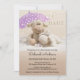 Elegant baby shower invitation featuring cute fluffy stuffed animals with an umbrella. The colours are light lilac with soft earth tones.