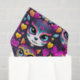 These cats are depicted in a variety of charming poses, some dancing, others with playful expressions, creating a dynamic and engaging visual. They are surrounded by delicate swirls of purple and pink, symbolising the intertwining of life and death. These vibrant colours add a festive touch to the overall design, perfectly representing the Dia de Muertos holiday.