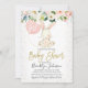Sweet pink, gold and green floral girl's baby shower invitation. This design is a sweet way to set the scene for an upcoming baby girl's baby shower. It features a cute bunny, heart shaped heart balloon, faux gold glitter heading, floral arrangement and faux gold glitter dots.