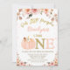 Cute rustic floral pumpkin first birthday invitation for a little girl featuring a pumpkin, a few floral arrangements and gold glitter and watercolor text and dots. This our little pumpkin is turning one girl's first birthday invitation is ideal for a fall girl's first birthday party.