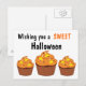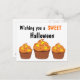 Postcards feature 3 Halloween cupcakes with orange frosting and candy corn on top says, Wishing you a SWEET Halloween.
