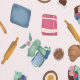 Add a touch of sweetness to your space with this adorable bakery-themed wallpaper. Featuring mint green mixers, and a variety of baking supplies and desserts like croissants, cakes, and cupcakes, this design is perfect for any kitchen or bakery-inspired room.