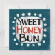 A cute typographic food design that says "Sweet Honey Bun". It's black and red text on a white rectangle with funky, playful white dots surrounding it, all on a teal background.