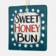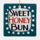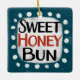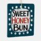A cute typographic food design that says "Sweet Honey Bun". It's black and red text on a white rectangle with funky, playful white dots surrounding it, all on a teal background.
