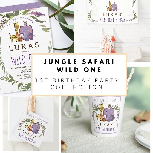 Offer your guests a thank you gift when you throw your baby's jungle safari themed wild one birthday party for your baby's 1st birthday. These sweet jungle safari animal birthday party gift bags feature a tiger, monkey, elephant, and a giraffe surrounded by botanical leafing with pink and purple flowers against a purple and white polka dot background. Personalise with your son or daughter's first name for a fun Wild One 1st Birthday Party favour gifts.
