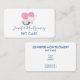 A business card with an adorable graphic illustration. A white kitty cat with a cute paw print image on her fur. Sleeping peacefully. A big pink heart behind her and some little stars too. Mint green background.