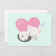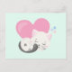 A postcard with an adorable graphic illustration. A white kitty cat with a cute paw print image on her fur. Sleeping peacefully. A big pink heart behind her and some little stars too. Mint green background.