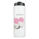 A thermal tumbler with an adorable graphic illustration. A white kitty cat with a cute paw print image on her fur. Sleeping peacefully. A big pink heart behind her and some little stars too.