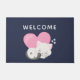Welcome door mat with an adorable graphic illustration. A white kitty cat with a cute paw print image on her fur. Sleeping peacefully. A big pink heart behind her and some little stars too. Dark blue background.