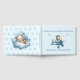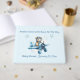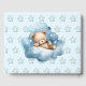 A cute teddy bear in a blue aeroplane flies through the clouds with a couple of stars overhead. All text can easily be changed to your information.