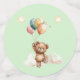 A cute teddy bear hanging on to a bunch of colourful balloons flies through the clouds with a couple of stars overhead. All text can easily be changed to your information.