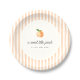 Cute "sweet little peach" theme baby shower paper plates, featuring a pastel peach striped background and a vintage script.
