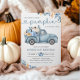 Sweet Little Pumpkin Blue Autumn Birthday Invitation features a rustic design including a pick-up truck, pumpkins, and fall leaves. The dusty blue and orange colour scheme is complemented classic serif font and dainty script.