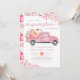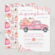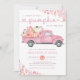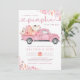 Pumpkin baby shower invitation featuring a pink pick-up truck, pumpkins, and autumn foliage