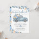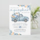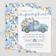 Autumn baby shower invitation featuring a rustic design including a pick-up truck, pumpkins, and fall leaves. The dusty blue and orange colour scheme is complemented classic serif font and dainty script.