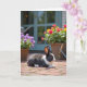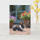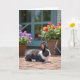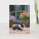 This card features a black-and-white rabbit resting on a warm brick patio, its dark eyes turned softly to the right as if watching someone it trusts ❤️. Fine fur detail and the lines of the bricks are crisp in the foreground, with tiny blades of green grass poking up between the stones like little shared secrets. On the left sits a woven basket filled with round purple blossoms, while on the right another basket spills out red and golden yellow flowers that feel like a cheerful offering 🌼. A muted teal door or window frame stands in the mid-ground, hinting at a cosy home just beyond the garden. Bright daylight creates gentle shadows, giving the scene a calm, affectionate mood, like a quiet moment spent together. Small garden items, including a watering can and a few hand tools, appear softly in the background, suggesting care and routine. The message text sits near the top in a soft, dark grey colour, and a smaller line of text is placed near the bottom in matching grey.