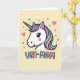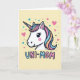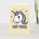 This card features the head of a gentle mythical horse-like creature, drawn in a simple graphic style with dark outlines and a sweet, friendly expression ❤️. Its face is bright white with big eyes, soft lashes, and a rosy blush that suggests a tender, affectionate mood. A flowing mane falls in neat pastel stripes of pink, pale blue, and warm peach, and the spiraled horn repeats those same soft colors. The background is a creamy yellow, giving the character a cozy, sunny setting. Scattered around are small hearts in blush pink and teal, along with tiny stars and dots that feel like little signals of caring and closeness 🌼. Near the bottom, the text “UNI-MOM” sits prominently, with “UNI-” in light blue and “MOM” in gentle pink, both edged in a dark blue outline. The hearts and stars float across the yellow field in matching pastel tones around the character’s head.