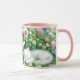 Personalised thermal coffee cup. Adorable white fluffy kitten sleeping under a pink rose bush watercolor ai art.