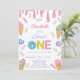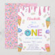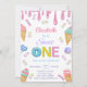 Adorable sweet one first birthday invitation for girl. Cute ice cream with sprinkles in pink , lavender, purple and melted ice cream drip.
