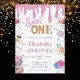 Adorable pink sprinkles sweet one 1st birthday invitation for baby girl. Cute lollypops, candy melting ice cream dribble and more!