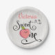 Sweet one birthday party paper plates. Features a cute happy face peach with fun typography
