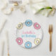 It's a " Sweet One " Doughnut birthday party round paper plates. It has pastel colour sprinkles and cute and sweet doughnuts. Perfect for little girls first birthday party celebration. It has fun typography script text and all the text here is easily customisable. Best fit for Doughnut theme kids 1st birthday.