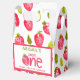 Personalised Strawberry Berry First Birthday favour box for baby girl turning sweet ONE. Watercolor strawberries, leaves and white floral accents. Berry 1st birthday party supplies.