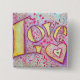 Watercolor painting of the golden yellow word "Love" with a double heart. Pink and purple highlights the letters and heart. A light splash of glitter across the top gives the painting a sparkly glow. Personalise Love art buttons or pins using the "Customise It" button. Make your own special love gifts with your own text or images. The love pin pendants are good for weddings, engagements, bridal showers, anniversaries, special occasions like new baby girl birth, and holidays like Valentine's Day!