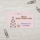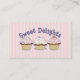 Whimsical bakery business cards done in a pink and cream striped background. Sweet graphics of a wedding cake and cupcake decorate the front of the card, and a trio of cupcakes, on the reverse side. Personalise the text, on the front for your cake baking business. Great for at home bakers and small businesses.