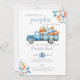 This stylish baby shower invitation features rustic autumn, fall leaves, and a cute blue truck full of pumpkins. The reverse features your special photo and a registry QR code. Designed by Thisisnotme©