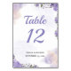 An elegant wedding table number featuring a soft purple floral design, adding a sweet and romantic touch for guests.