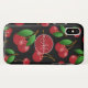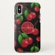 Sweet cherries iPhone X tough case featuring a colourful pattern of random single and paired cherries with stems and leaves still intact on a customisable black background - customise with her name and monogram - by katz_d_zynes