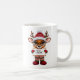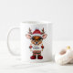Personalised kids Christmas morning cocoa mug with a baby reindeer wearing Christmas pyjamas.
