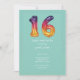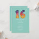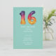 Teal background with purple, pink, and gold mylar “16” balloons with rainbow polka dots and white type.