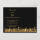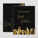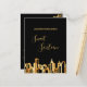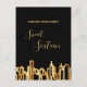 Faux gold and glam for a Sweet sixteen 16th birthday! An elegant black background with faux gold city skyline as decoration. The text: Sweet Sixteen on front is written with a golden modern hand lettered style script. Template for name, and party details on the back.
