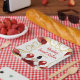 This sweet sixteen plate features an elegant gold frame, a beautiful princess with brown hair and a red dress, flowers and a balloon. This is perfect for a sweet sixteen birthday party.