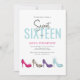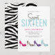 This design features a birthday party invitation, perfect for sweet 16 sweet sixteen, a colourful chic girly, fun funny, whimsical cute, women's girls shoes, animal print, a simple stylish, script typography
