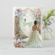 Beautiful image of a teen girl wearing a gorgeous mint green dress with white lace accents. She is standing near a pretty forest as a river flows by. Sweet 16 is done in a pretty mint green glitter font. There is a gold frame with vines, pink flowers and delicate,magical Fairies. Personalise with your information.